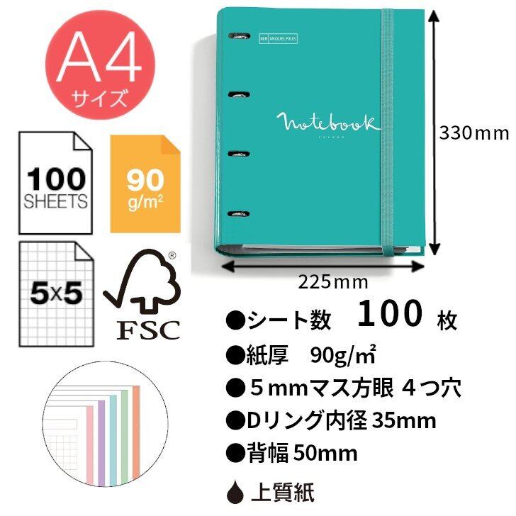 A4サイズの4つ穴Dリングバインダー!快適な書き心地でパステルな方眼ルーズリーフ100枚付き!